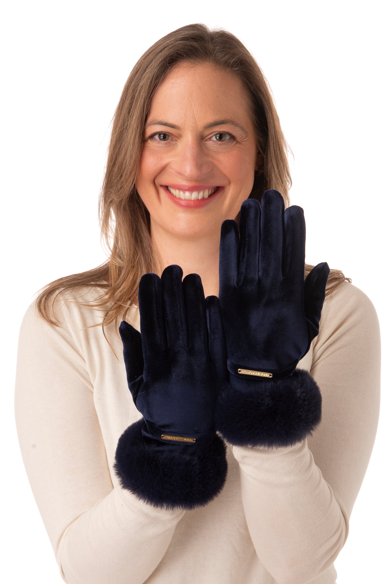 A stylish winter glove in sumptuous velvet and with a coordinating faux fur cuff, this classic accessory comes in a range of colours and with smart metal detailing, the perfect addition to your winter accessories collection.   A screen touch finger means you can use a mobile phone whilst wearing.