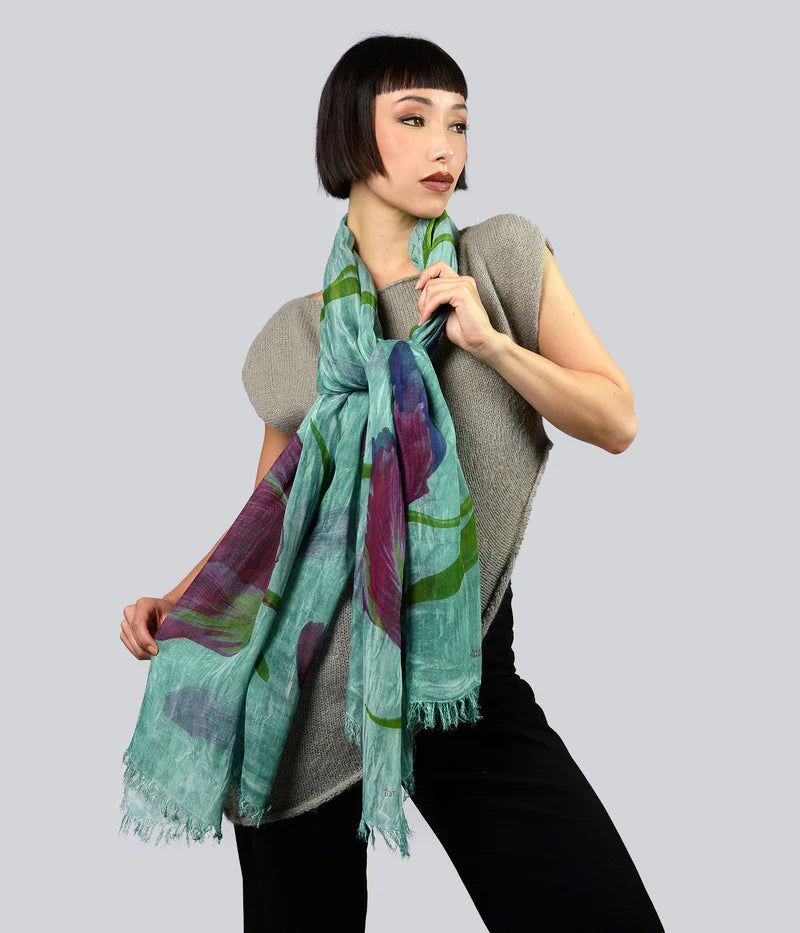 Our new bamboo scarves with designs from artist collections are a beautiful addition to our accessories collection. Flowers, such as roses in delicate tones, are characterized by overlapping brush strokes that enhance their beauty, making each scarf romantic and unique. A beautiful range of scarves made of bamboo yarn, born from the idea of combining art and nature.